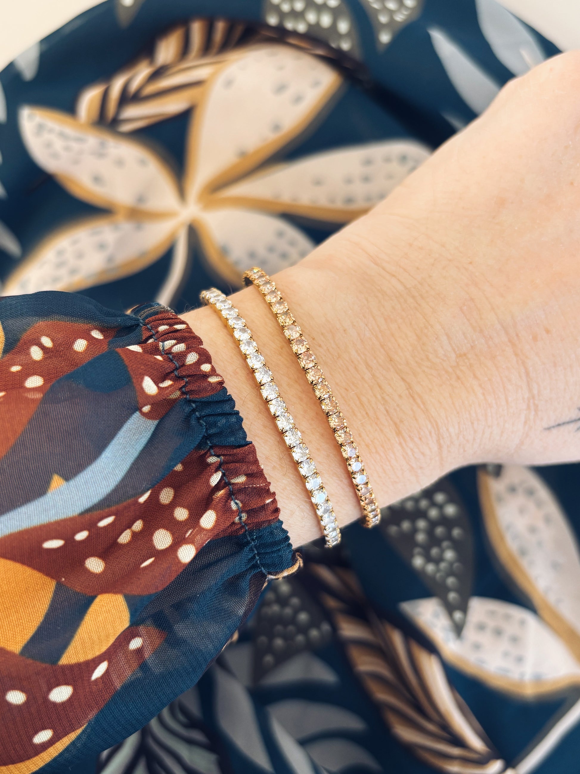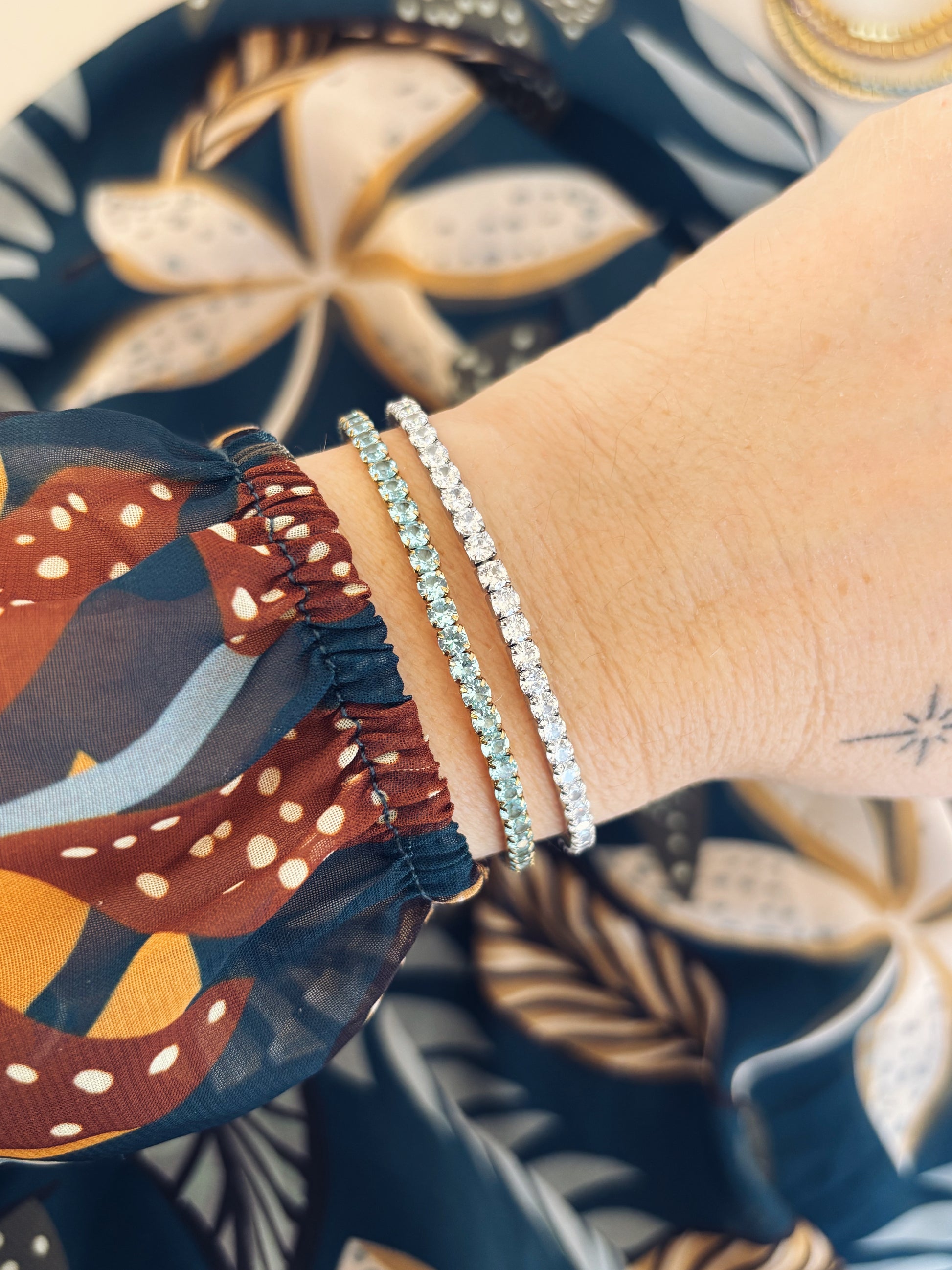 Bracciali tennis elastici in acciaio con zirconi colorati.