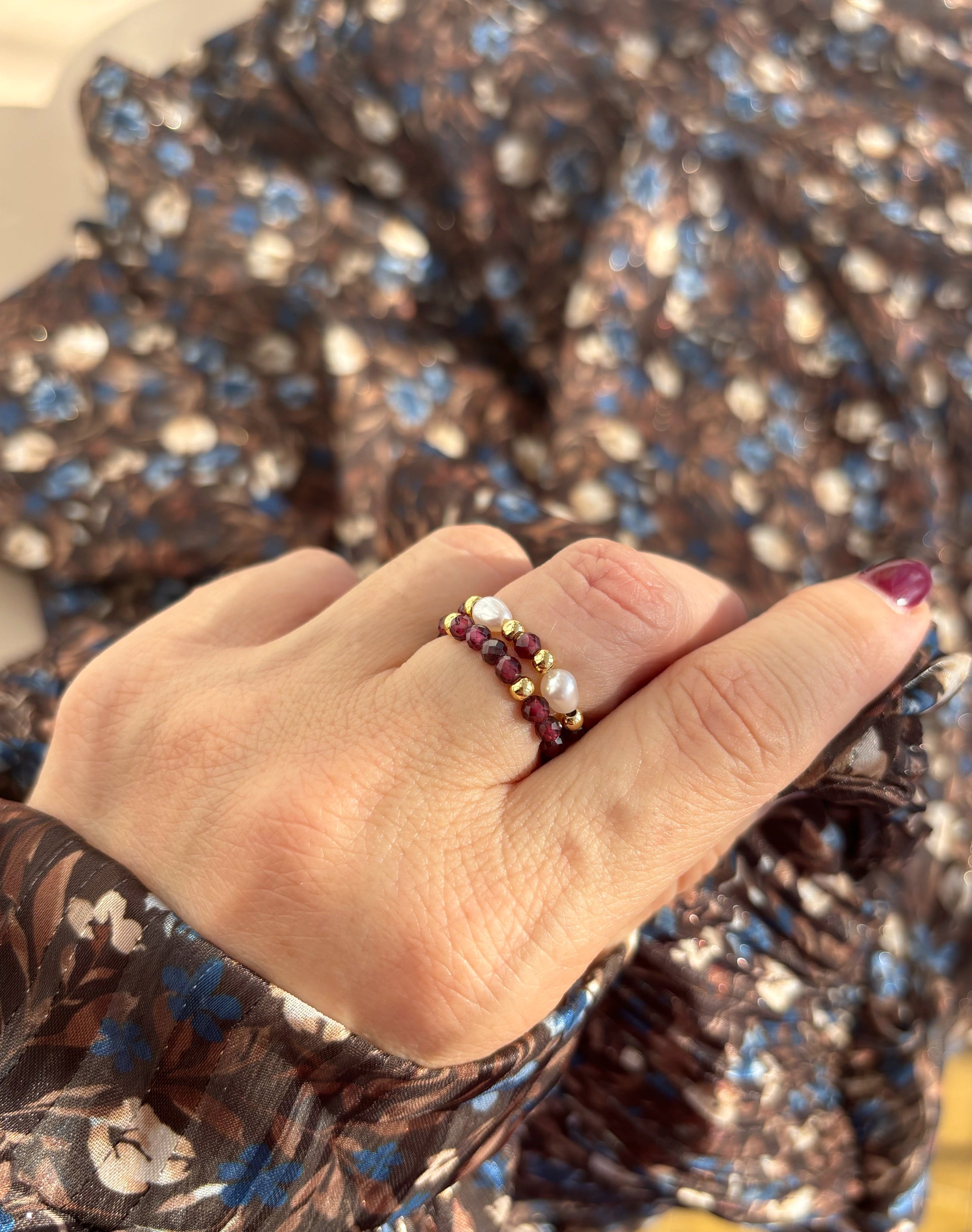 Anelli realizzati con filo elastico con perle di fiume e pietre dure.
