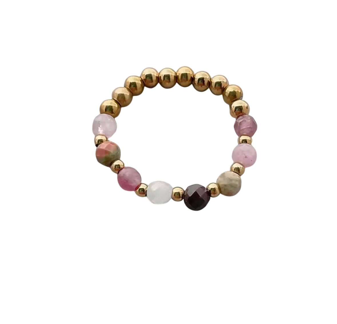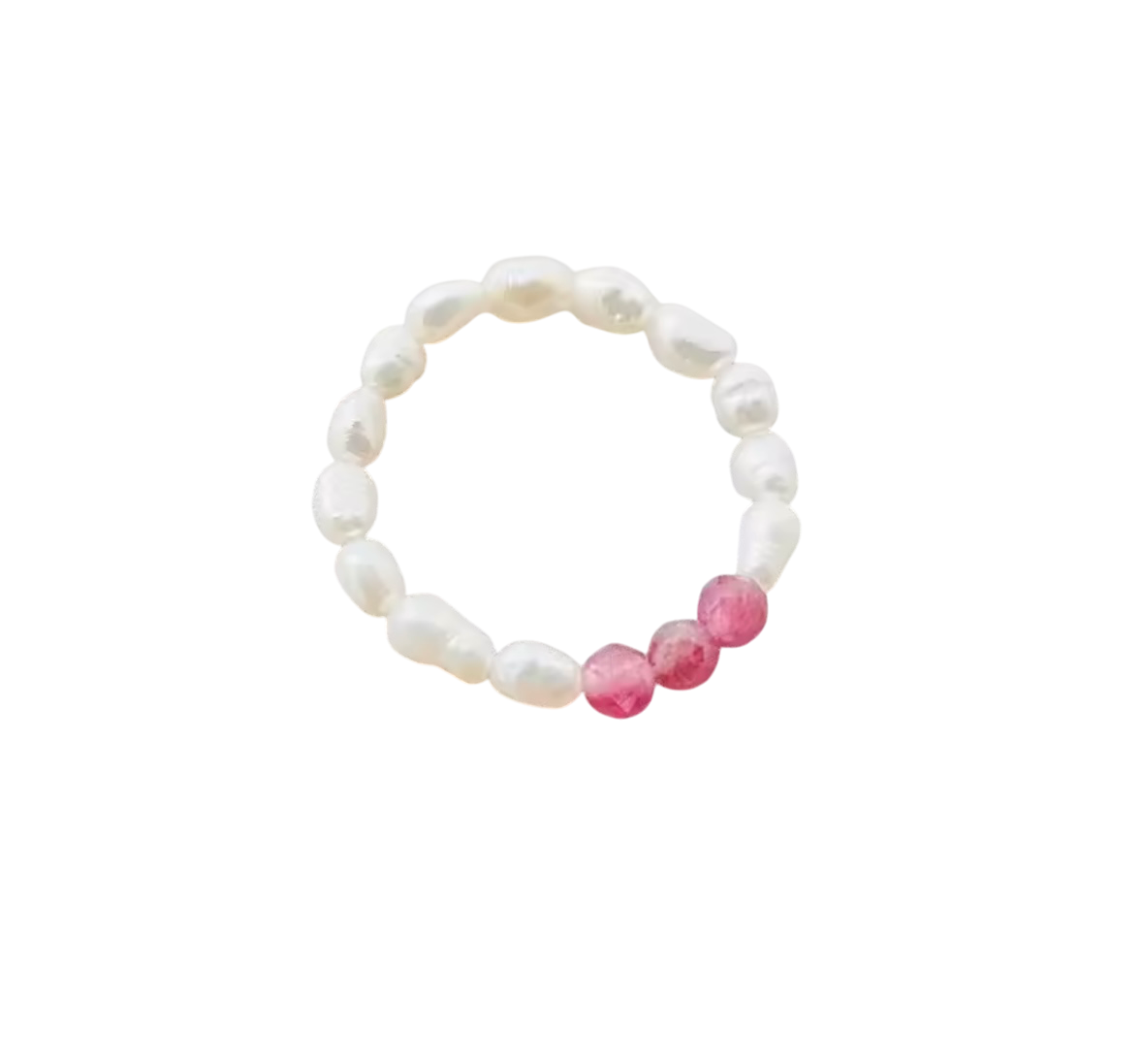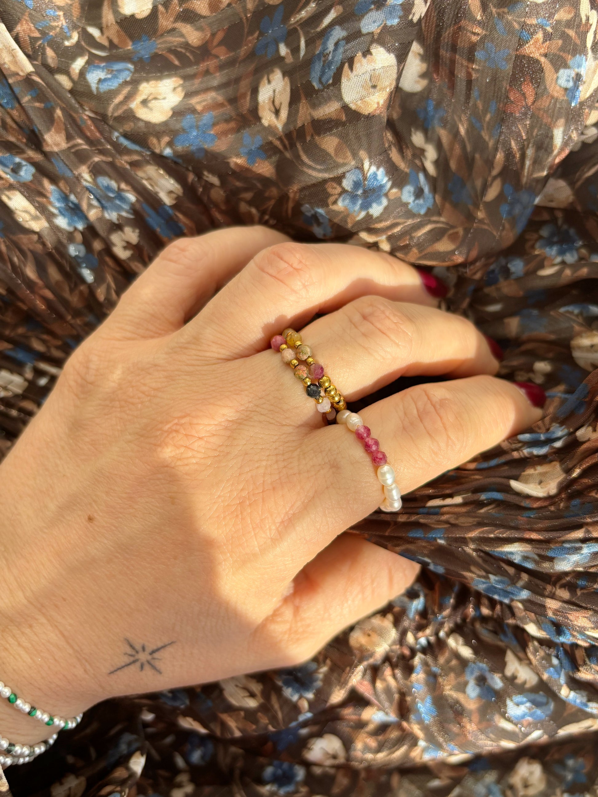 Anelli realizzati con filo elastico con perle di fiume e pietre dure.