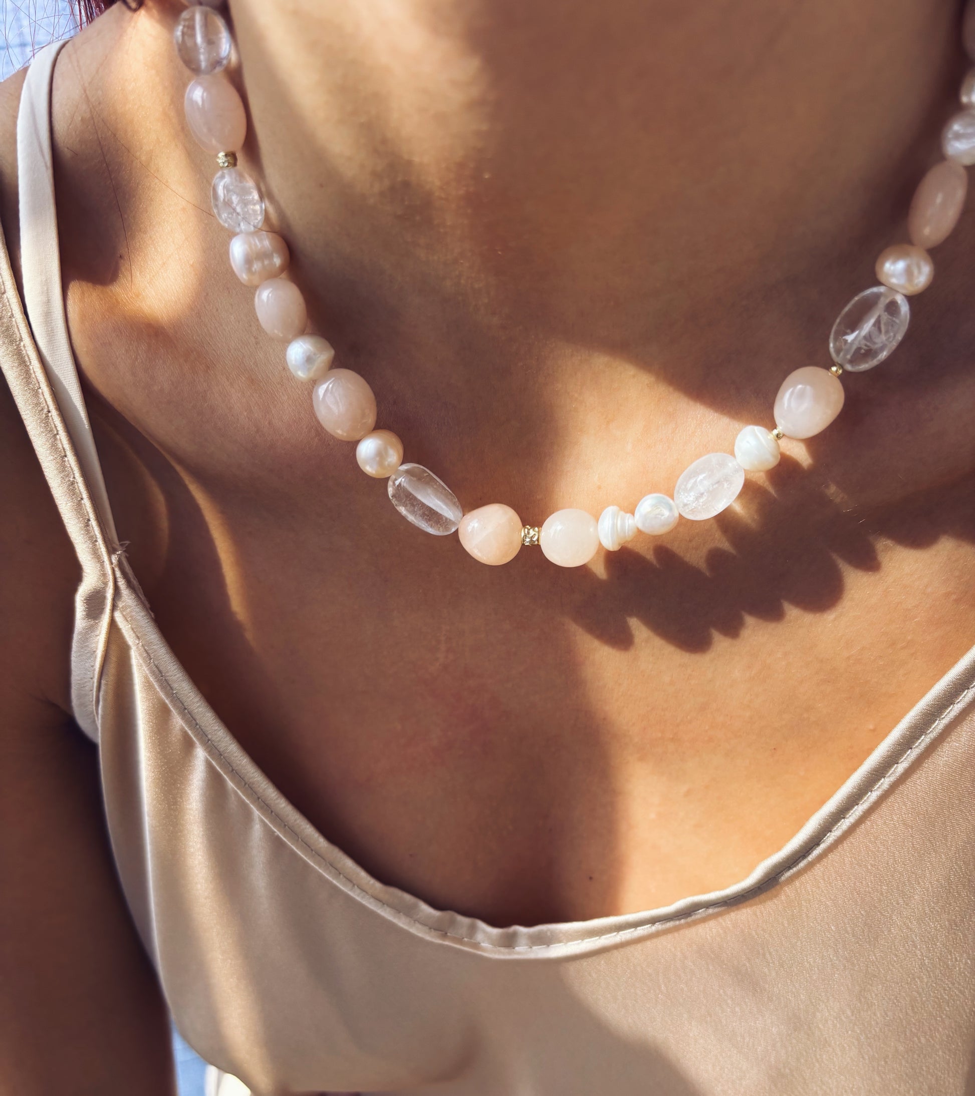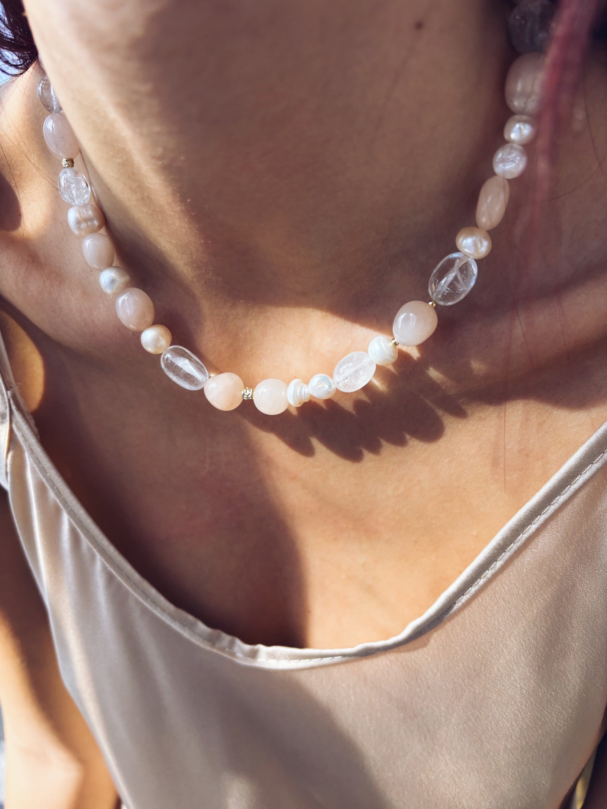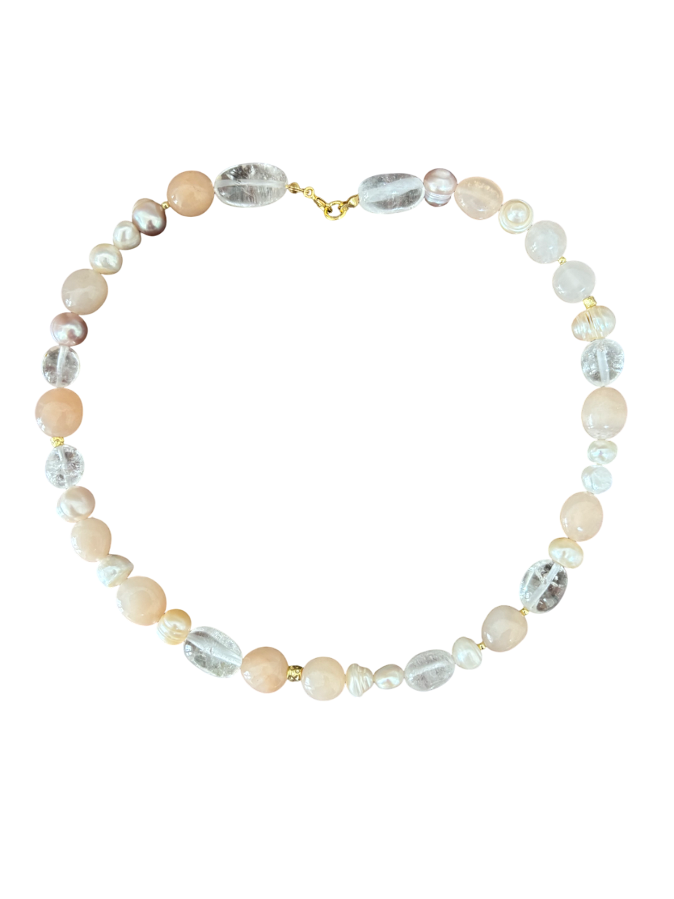 Collana realizzata con perle naturali, sassolini di quarzo pesca, sassolini di cristallo di rocca, rondelle e pepite in argento 925 dorato.