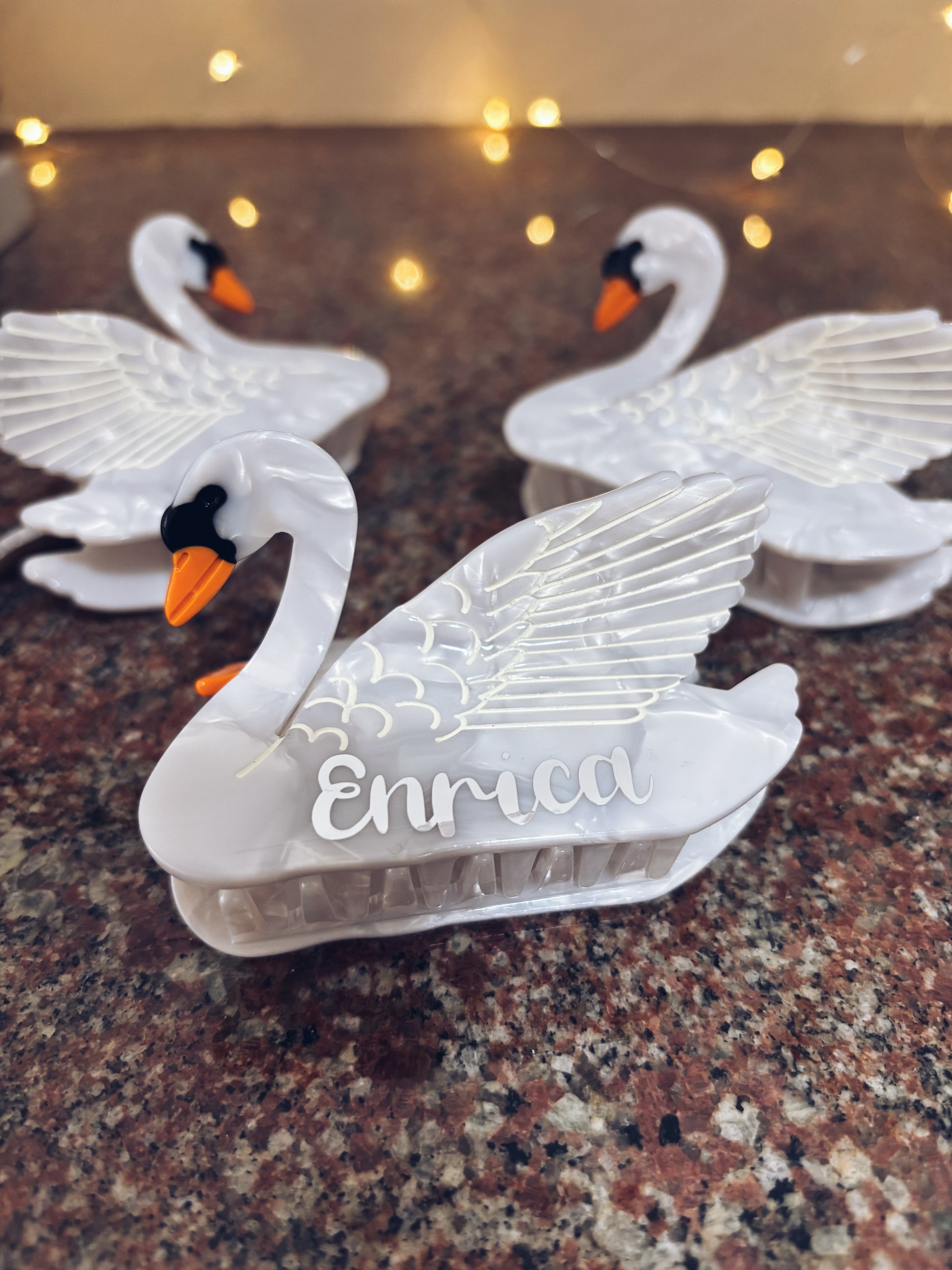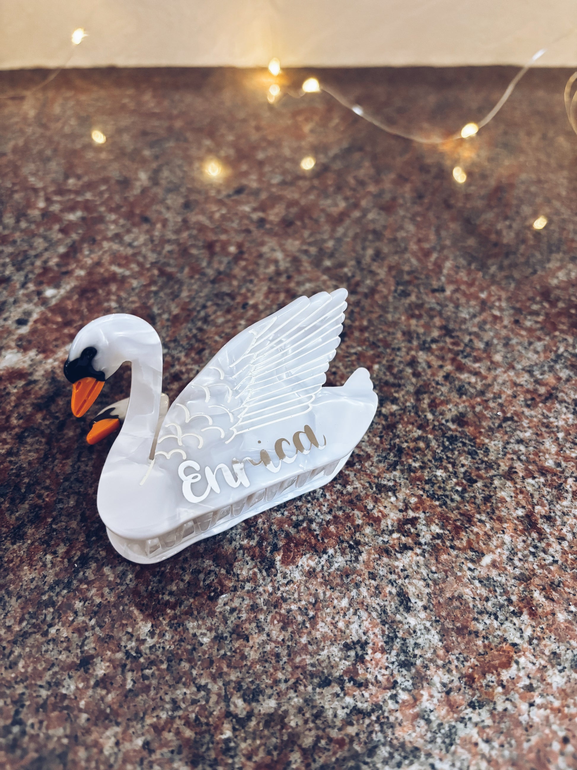 Pinza per capelli in acetato a forma di cigno da personalizzare.